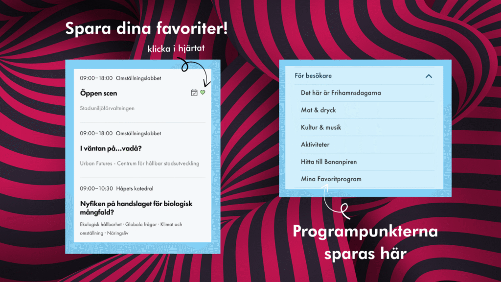 Navigera in på scenprogrammet och klicka i hjärtat på de programpunkter du vill spara. Du hittar sedan dina sparade favoriter i hemsidans huvudmeny – för besökare – mina favoritprogram.